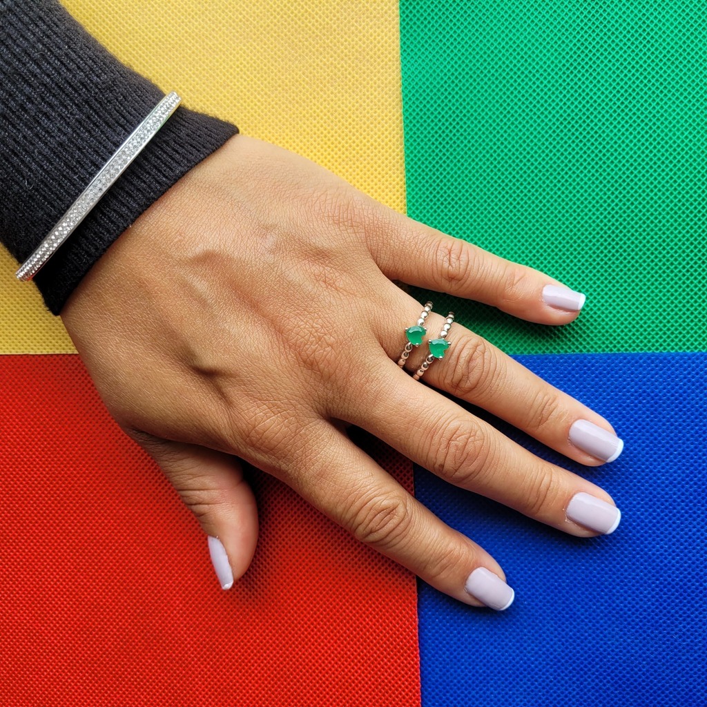 A combinação do meio aro trabalhado em mini bolas com a pedra em formato de coração cria uma mistura de formas no anel Formas e Cores que é ao mesmo tempo romantica e atemporal.
