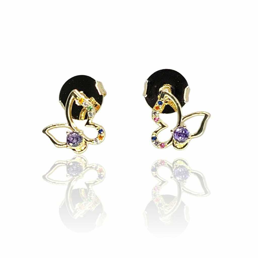Brincos em formato de borboleta vazado com Zircônias Colours banhado em Ouro 18k.